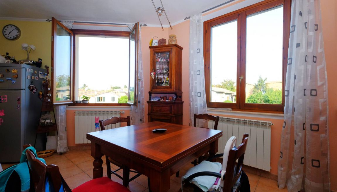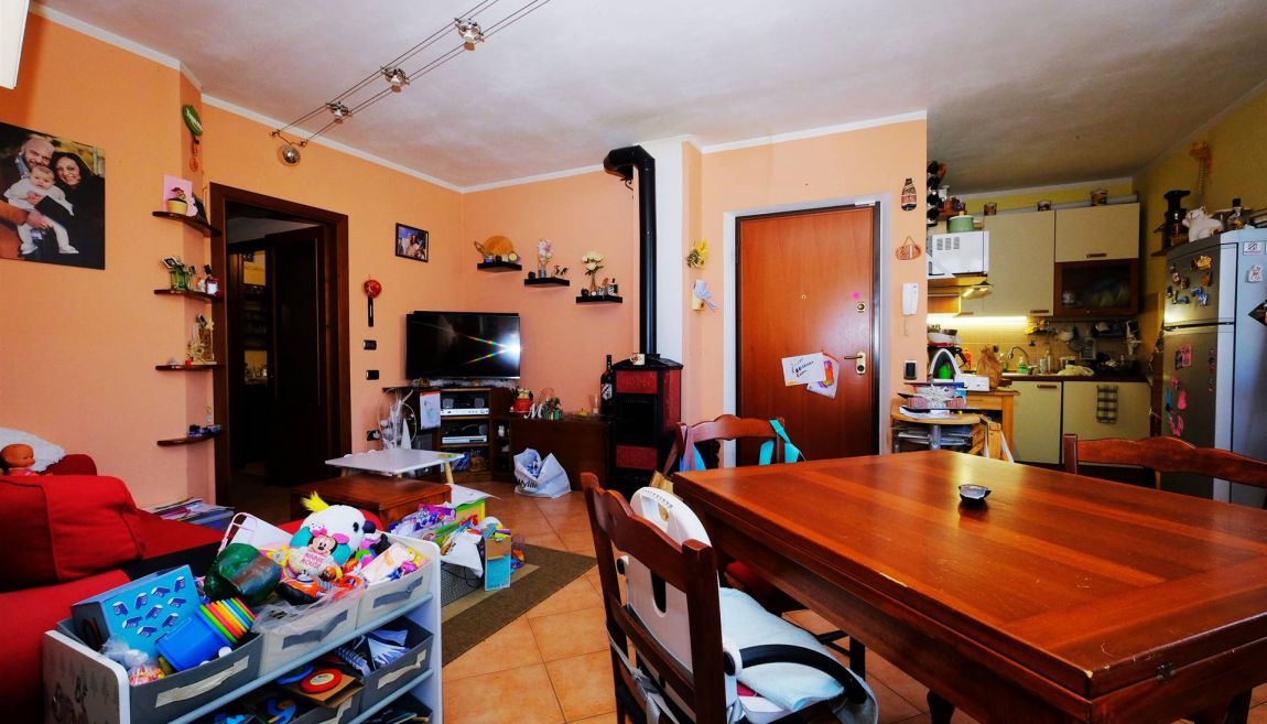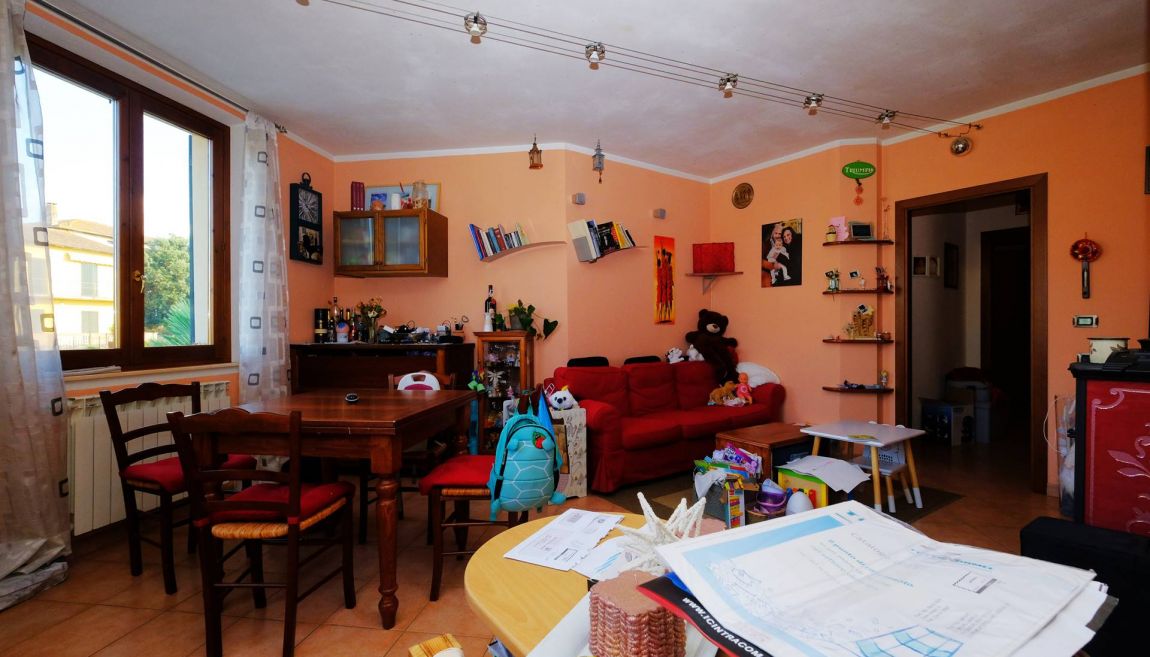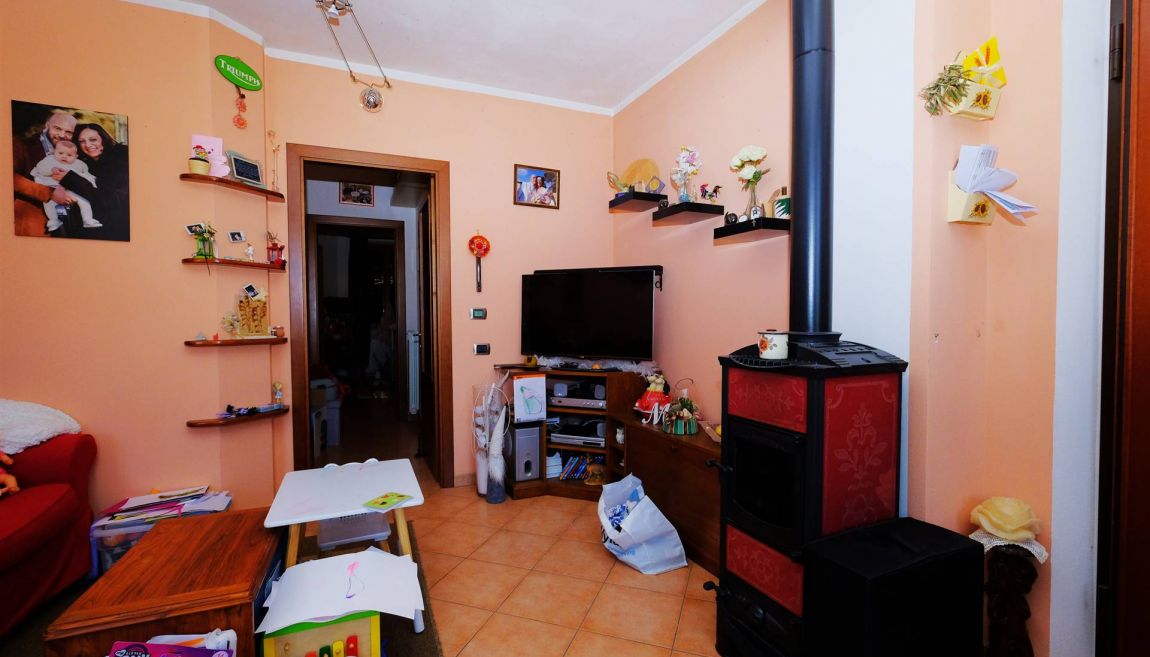 E' composto da una scala d'ingresso comune con un altro appartamento, ampio salotto con angolo cucina, due camere da letto (una grande matrimoniale ed una utilizzabile anche come matrimoniale), bagno con doccia e vasca, ripostiglio, sottotetto, canna fumaria per eventuale camino/stufa a legna/pellet.